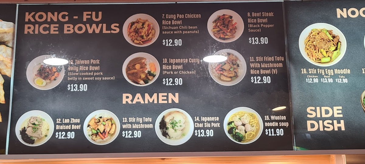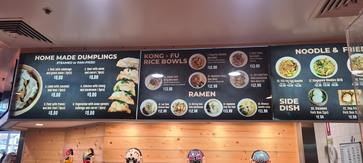 From a reviewer’s perspective, Kongfu Dumpling at Ground Level - Shop GD280, 154/164 Horton Parade, Maroochydore, presents a menu that skillfully balances variety and comfort. The Home Made Dumplings selection impresses with options like Pork With Cabbage And Green Onion, Lamb With Zucchini And Leek, Pork With Prawn And Bok Choi, Beef With Onion And Carrot, and Chicken With Celery And Mushroom, each promising a satisfying bite with fresh, well-seasoned fillings. For heartier meals, the Kong-Fu Rice Bowls feature standout dishes such as Taiwan Pork Belly Rice Bowl, Lan Zhou Braised Beef, Kung Pao Chicken Rice Bowl, Japanese Curry Rice Bowl, and Beef Steak Rice Bowl, catering to both classic and adventurous tastes. The Ramen offerings, including Stir Fry Tofu With Mushroom, Japanese Char Siu Pork, and Wonton Noodle Soup, deliver warmth and depth of flavor, perfect for noodle enthusiasts. Those seeking something lighter or with a different texture can explore the Noodle & Fried options like Stir Fry Egg Noodle and Singapore Noodles, which are both aromatic and satisfying. Finally, the Side Dish of Steamed Pork Bun provides a comforting, snackable addition to any meal. Overall, the menu demonstrates Kongfu Dumpling’s dedication to variety, flavor, and traditional Asian comfort foods, making it a compelling choice for anyone in Maroochydore looking for a casual yet flavorful dining experience.